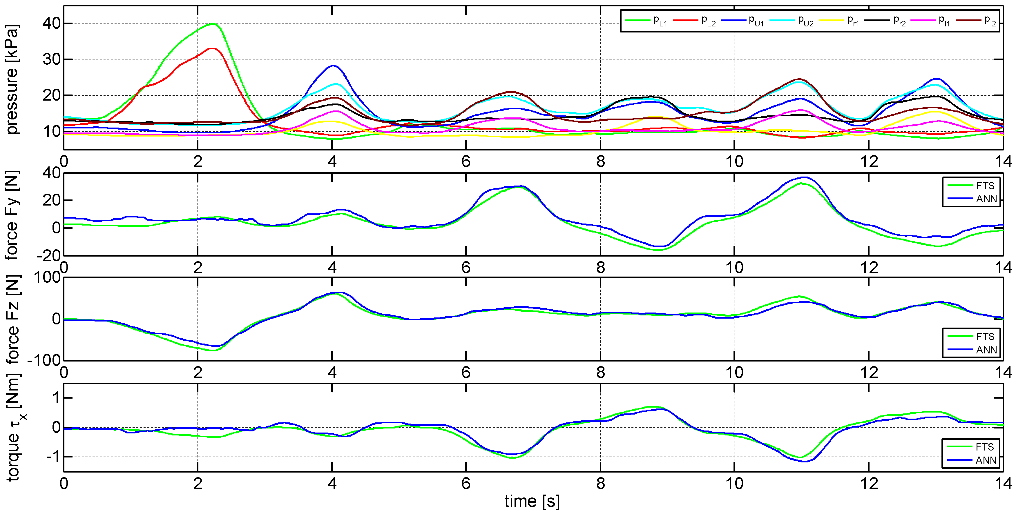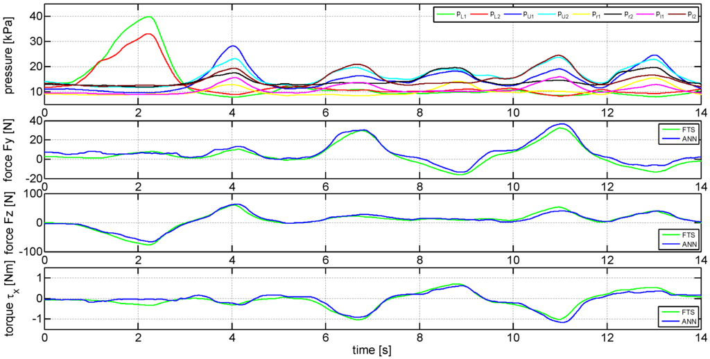 The goal of this experiment was to show if it is possible to estimate the two forces and the one torque in the frontal plane of the subject. For the experiments performed ANNs are used, each with a number of hidden neurons, see Section 4. The same experiment was repeated four times with three subjects, that were asked to apply only forces in y and z-direction as well as torque around the x-axis, see Figure 4. The experimental results of one experiment with subject 1, that trained the ANNs according to the procedure presented in Section 4, are shown in Figure 8 as an example. Shown in the first plot are the current pressures of the eight chambers of pneumatic padding used as input for the ANNs, according to Equation (3). The second plot shows the measured force in y-direction using the reference FTS (green line) as well as the pneumatic padding using ANN (blue line). The third plot presents the measured force in z-direction and the fourth plot the torque around the x-axis. The result shows, that it is possible to use ANNs in combination with the pneumatic padding to estimate roughly HRI forces/torques based on pressure variations if the subject that is using the system has also trained the networks previously.