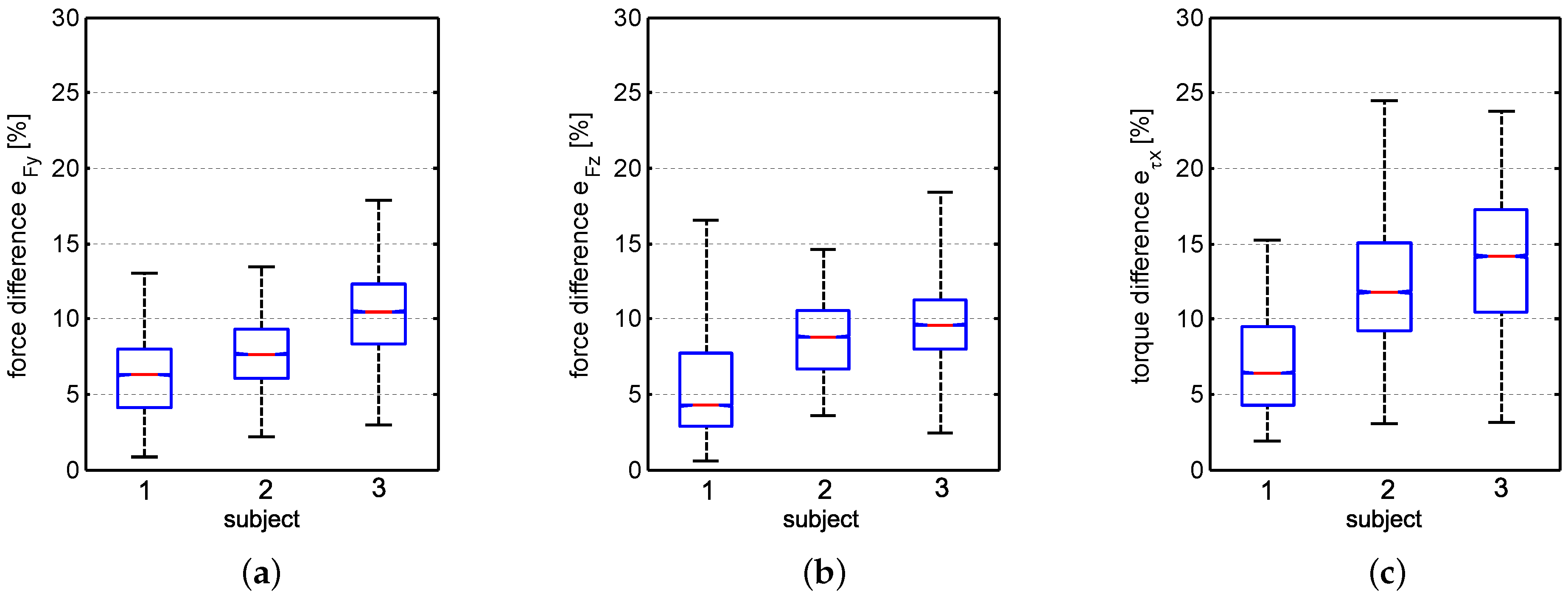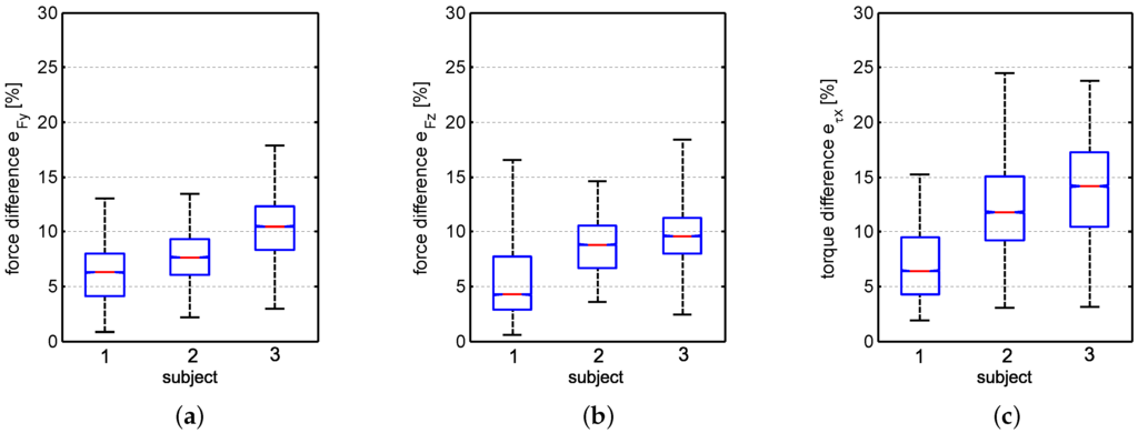 Experimental results showing average force/torque difference of the four experiments performed with the three subject using a box-and-whisker diagram. Force difference in y-direction is shown in (a), in z-direction in (b) and torque difference around the x-axis in (c). The ANNs are trained with subject 1. The results show that it is possible to roughly estimate the interaction forces/torques if different subjects are using the sensor system, which can be seen as indicator of applied force.
