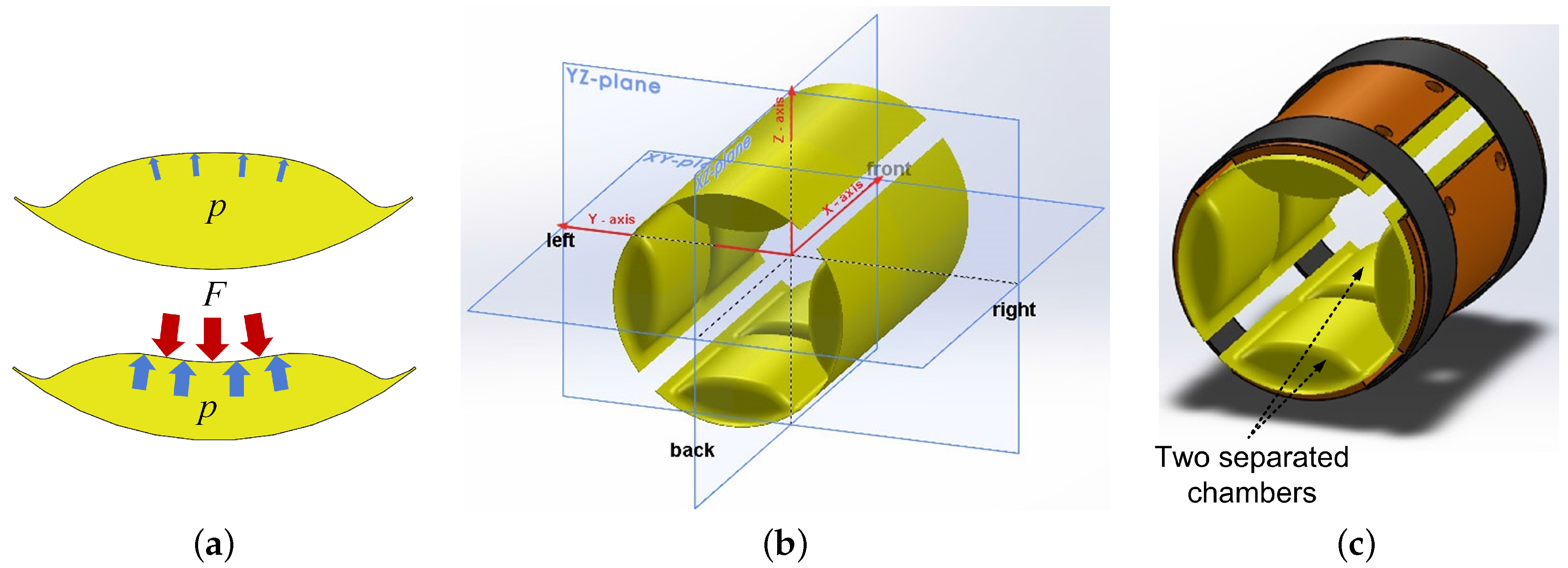 Illustration of one pressurized air-pad without (upper figure) and with (lower figure) acting interaction force (a); 3D model of 4 air-pads in the arrangement used for the pneumatic padding (b) and final design of pneumatic padding with cuff. Each air-pad is divided into two separated chambers, which is required to estimate forces/torques in three-dimensional space (c).