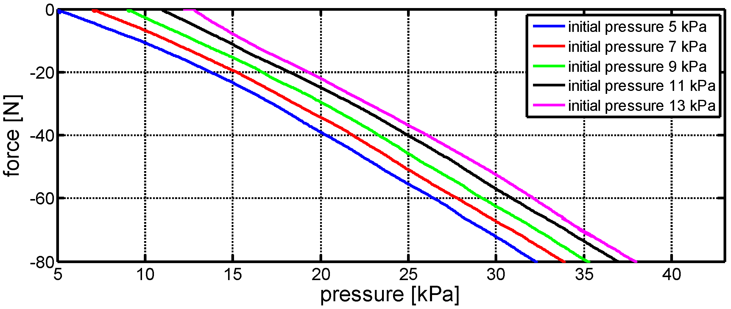 Basic characteristic of air-pad describing the relationship between interaction force applied on the pad and change of air pressure using different initial pressures.