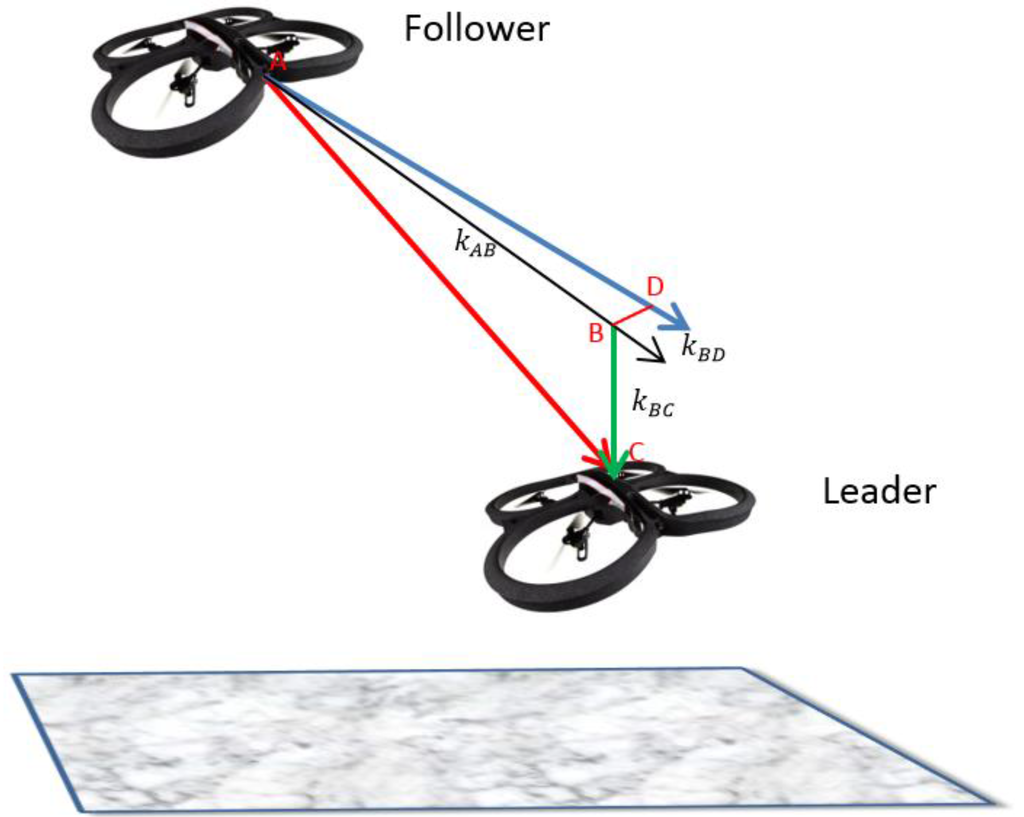 Research in vision-based Leader-Follower algorithms for micro-UAVs often make use of a known mathematical model for the Leader in state estimation algorithms, as well as GPS or visual markers on the Leader [13,14,15,16]. State estimation algorithms, such as Kalman filters, are often used as a default to compensate for delays or momentary loss of GPS signals. However, are these state estimation algorithms really necessary to achieve Leader-Follower behavior on micro-UAVs? For example, Cowan et al. argued that if the constraint of maintaining visibility with the Leader is satisfied and as long as the Leader keeps moving, any linear controller, which does not depend on Leader pose estimation, is sufficient to achieve and stabilize Leader-Follower formation flying [5].