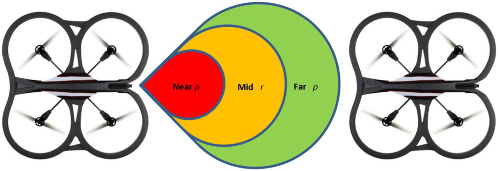 Assumption 3. Using Figure 2, we assume three zones with distance threshold values called near zone, mid-zone and far zone. It is assumed that the value of from Equation (2) is given by the mid-zone; while the stretched or compressed length is given by the values of the far zone or the near zone, respectively. Since and are distance terms, we can convert them into velocity components as depicted in Equation (3):