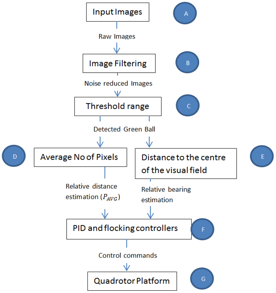Secondly, the best performing minimal cost vision algorithm was used in the Leader-Follower algorithm which was tested by commanding a micro-UAV to follow a green ball held by a human (Section 6.2). The human’s motions were random and not predictable. This enabled us to test the robustness of the Leader-Follower algorithm for formation flying. Finally, two micro-UAVs were used in Leader-Follower formation flying with the Leader commanded to fly at a forward velocity and the Follower commanded to maintain formation with the Leader (Section 6.3).