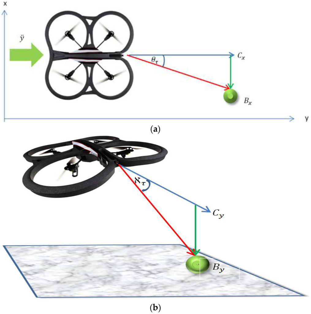 The relative bearing of the ball to the Follower micro-UAV’s attitude and altitude was estimated using the relative distance between the center point of the visual frame (, ) and the position of the ball (, ) on the visual field as shown in Figure 4 and according to Equation (11). Where and are the relative yaw and pitch angles respectively. The constants and embed the spring constants connecting the Follower to the Leader in these axes as well as scaling the pixel values to the angle values. The values of the constants were empirically determined. Using Equation (11), the Follower can adjust its relative bearing to the Leader: