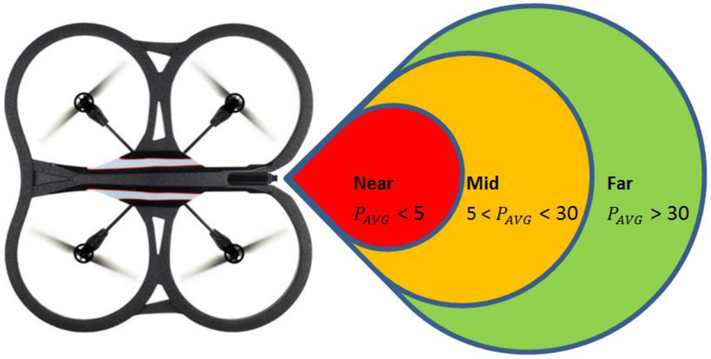 In the experiments conducted, the far zone corresponded to distances above 1000 mm, the mid-zone corresponded to distances between 300 mm and 1000 mm and the near zone was less than 300 mm. The values of , , , and distance were passed to the low-level controller, which will be discussed next.