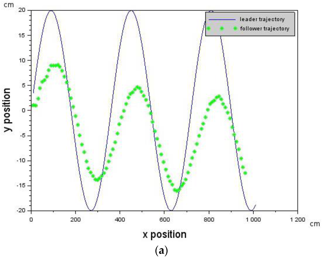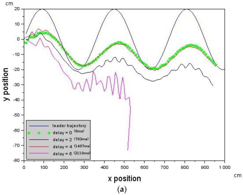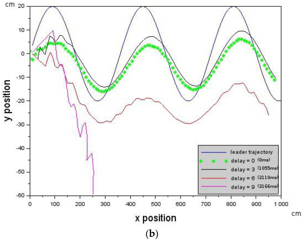 The Leader was commanded to generate the cosine trajectory with a forward velocity of 10 cm/s while the Follower was commanded to have the following velocity values [,,] = [−10.0, 0.0, 10.0] cm/s. Deterministic delays were introduced on the follower. Delay values that increase from 0 (0 ms) to 6 (2110 ms) were first introduced into the control loop. Figure 6a shows that the Follower is able to track the trajectory of the Leader (blue curve) up to a delay of 4 (1407 ms) after which it loses the Leader.