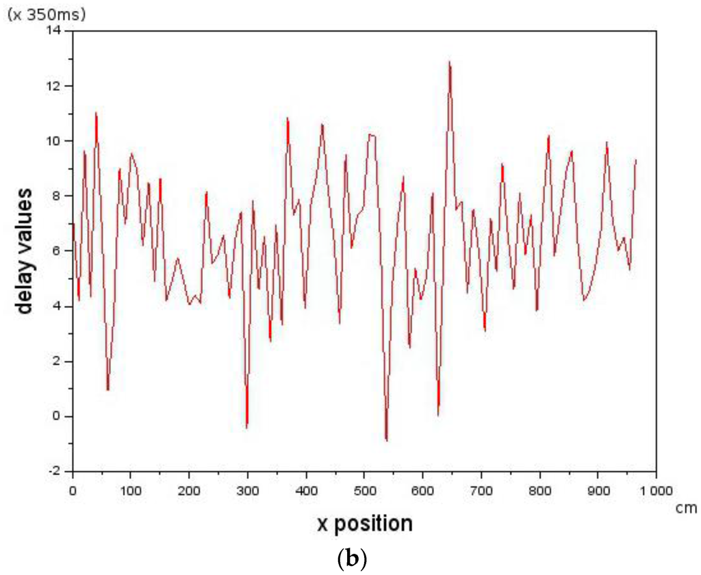 Showing how introduced deterministic delays affect Leader-Follower formation. Each curve is an experiment with an associated delay value. (a) The Follower loses track of the Leader at delay = 6 (2110 ms). The velocity of the Follower was 10 cm/s, while the velocity of the Leader was 10 cm/s as well. Each curve is an experiment with an associated delay value; and (b) due to an increase in the Follower’s velocity to 10.2 cm/s, it is able to keep track of the Leader up to a delay of 9 (3166 ms). The Leader’s velocity was 10 cm/s.
