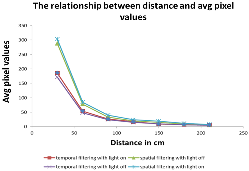 The effects of spatial and temporal vision filtering under different lighting conditions. The spatial filtering technique has a higher number of average pixels value than the temporal filtering technique at closer distances but similar values at larger distances. For both approaches, the maximum visual distance is about 200 cm.