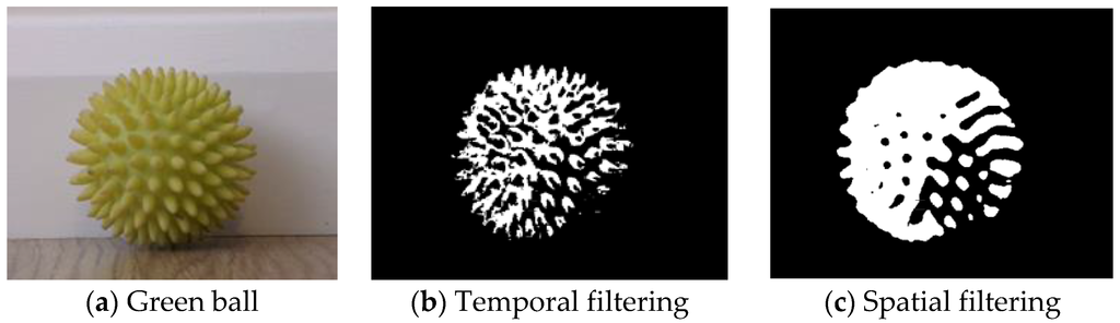In this section, the proposed minimal cost vision algorithms (spatial and temporal filtering) were first compared (Section 6.1). The experiments were conducted in an office space environment that had little or no changes in artificial illumination. The environment had window blinds which could be opened to allow in natural lighting or closed to exclude it. A green ball with a diameter of 63 mm was used in the experiments. Other green objects that could lead to false detections were removed from the environment.