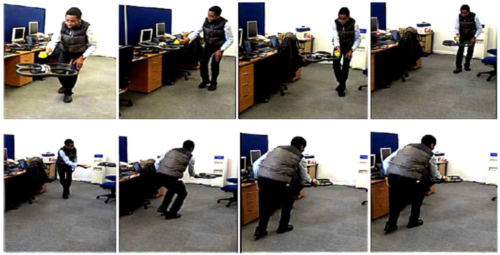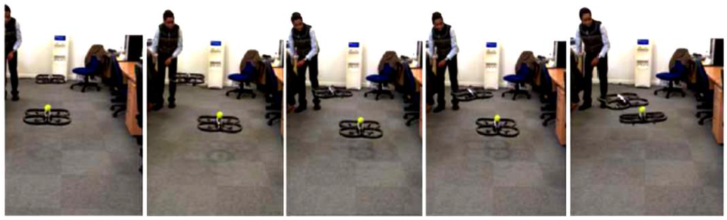From the experiments carried out in Section 6.1 above, it was decided that using the spatial filtering technique was the best approach to ensure Leader-Follower formation flying between two micro-UAVs due to the greater number of pixels detected. An experiment in which a micro-UAV was following a ball was carried out. The ball was held by a moving human. Results in Figure 10 show that the micro-UAV successfully tracked the human [26]. However, it should be noted that the presence of colors that fall into the range of HSV values used as feature descriptors sometimes affects the Leader-Follower formation flying. For example, Leader-Follower formation flying experiments conducted in three different indoor environments achieved a success rate of 80% in two of the environments and 0% in the last one. A 0% success rate was obtained because of the micro-UAV falsely identifying an object as a feature. Nevertheless, biological sensors are not always foolproof [27].