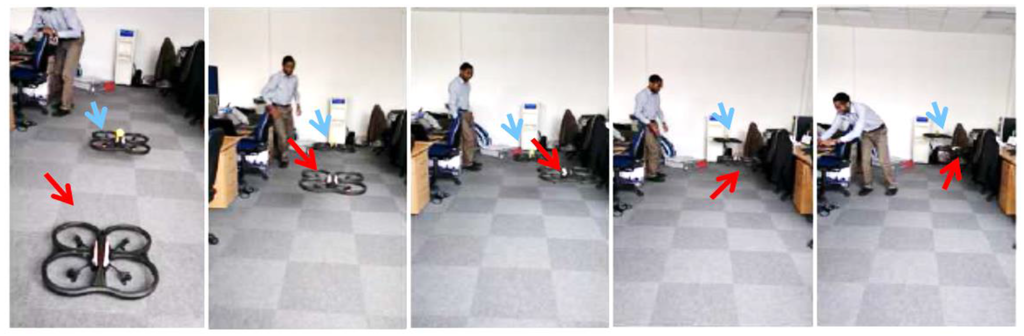 The second autonomous aerial flocking attempt with a Leader micro-UAV (Blue arrow) moving forward and a Follower micro-UAV (Red arrow) results in continuous flocking of two vehicles.