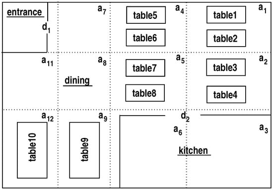 As an illustrative example that we will return to throughout the paper, consider a robot waiter that seats people at tables and delivers orders in a restaurant (as described in Section 1). Figure 1 provides an example map of this domain: humans and the robot waiter can be located in different areas of this map. The sorts of the domain are arranged hierarchically, e.g., and are subsorts of ; and are subsorts of ; and are subsorts of ; is a subsort of ; and , , and are subsorts of . We include specific rooms, e.g., and , and consider objects of sorts, such as , and , to be characterized by attributes, such as , , and . The sort is used for temporal reasoning. The focus in this paper is on explanation generation, i.e., on the robot’s ability to explain unexpected observations and partial scene descriptions by hypothesizing the occurrence of exogenous actions. For instance, if the robot waiter believes that is unattended and is unoccupied at a specific time step, but observes at within a few time steps, it may infer that another waiter seated at in between. To fully explore the key distinctions that characterize the multidimensional space of systems that generate such explanations, we make two simplifying assumptions for the first part of our paper that include a comparative study: