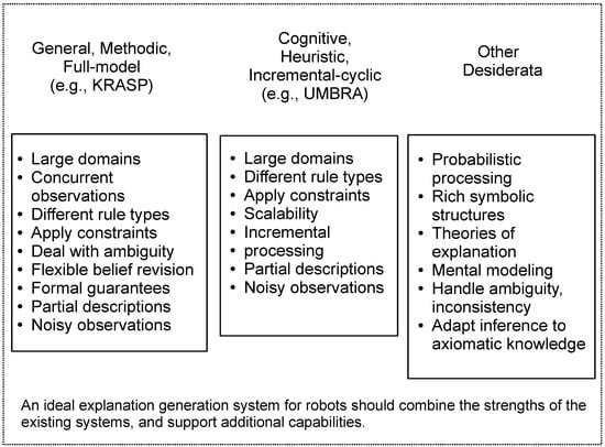 The previous section discussed some desirable capabilities of an explanation generation system for robots. These capabilities were identified by comparing KRASP and UMBRA in the set of scenarios in Section 4. However, as stated in Section 3.1 where we introduced three fundamental distinctions, the space of explanation generation systems is characterized by other distinctions and thus other capabilities. In addition, KRASP and UMBRA have some capabilities that were not explored in our comparative study. Based on our review of KRASP, UMBRA, other existing explanation generation systems, and the needs of robotics applications, this section makes some additional, more speculative recommendations. We summarize our central desiderata, including those not illustrated by the systems we have considered, in Figure 4.