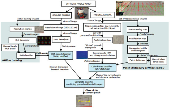 The rest of the paper is organized as follows. Previous work is reviewed in Section 2. In Section 3, a general overview of the proposed methodology is described and the testbed and the dataset of images used in this research are presented. Section 4 explains the Gist-based classifier used to classify the terrain beneath the robot. The Gist descriptor and the SVM training methodology are also described. The color-based classifier and the rectification strategy dealing with frontal images are both discussed in Section 5. Section 6 deals with the proposed procedure to improve the former color-based classification by combining ground and frontal images. Section 7 provides experimental results of the proposed approach. Section 8 concludes the paper and outlines future research.