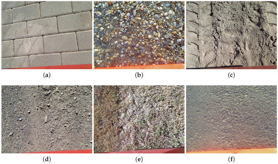 Example images representing six of the terrain classes used in this research. Notice that these images have been taken by the downward-looking camera from 0.49 (m) above the ground. (a) Pavement; (b) Gravel; (c) Sand; (d) Compact sand; (e) Grass; (f) Asphalt.