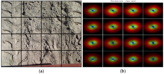 At this point, we would like to point out some issues related to the physical conditions in which these images were obtained. First of all, the robot mostly moved at a speed of 0.4–0.5 (m/s). The dataset includes a reasonable variety of surface conditions in each type of terrain. In particular, different grass sizes and differently-sized grains in the gravel terrain were considered. The images of the sandy terrain also present different traces. The rectangular bricks of the pavement surface were not always aligned in exactly the same orientation. Furthermore, special mention must be made of the fact that the images were taken on different days and at different hours, so different lighting conditions were ensured. When the robot moved close to 1 (m/s), we noticed a certain blur effect in the images. However, some of these images were retained in our dataset in order to check the robustness of our strategy.