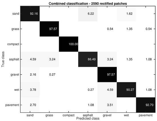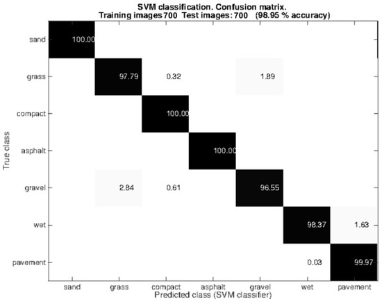 After this analysis, the size (px) was selected for comparing the images during the query time as a compromise between performance and computation time. As explained, the 5-fold random cross-validation approach was used for splitting the dataset. After that, 50% of the images were used for training the SVM and 50 % for testing it. Furthermore, we have added 90 images more for each class. This resulted in a dataset of 1400 images (), 700 used for training the SVM and 700 for testing it. Figure 6 shows the confusion matrix related to the testing images. Observe that the Gist + SVM classifier operates correctly with almost all the classes. Grass is sometimes misclassified with compact sand (0.32%) and gravel (1.89%), which can be explained by the fact that the grass in certain regions was very short and closely resembles compact sand or gravel. Gravel is also misclassified with grass (2.84%) and compact sand (0.61%). Again, this result shows the similarity between these classes. It is not surprising that the wet pavement and dry pavement are sometimes misclassified given that in certain images the amount of water in the wet pavement is small.