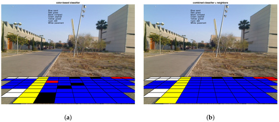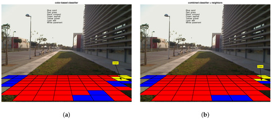 Experiment 2. Performance of the proposed approach in a scenario composed of two different terrain types (grass and pavement). Notice how the complete classifier performs fairly well except for the curbstone (yellow cell). (a) Classification of the color-based classifier; (b) Classification of the complete classifier.