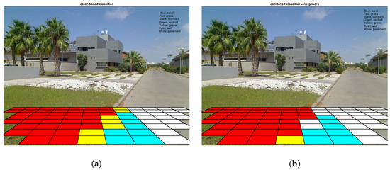 Figure 10 shows results from the first experiment. In this case, sandy soil and pavement are present in the frontal view; the robot is on sandy terrain. This experiment shows the poor performance of the color-based classifier because several patches are misclassified as compact sand (black cells) and as grass (red cells). Furthermore, some patches relating to the pavement are misclassified as sand. The rectified patches dealing with the curbstone do not belong to any particular class, although here they are classified as gravel. This does not represent misclassification because this class (curbstone) was not considered in this research. Observe that the complete classifier improves the former result. In particular, now only 4 patches are misclassified as opposed to 9 misclassified by the color-based classifier (sandy area). Notice that although the robot is actually on sandy terrain, the proposed classifier with the 7-neighbor filter also improves the classification of the patches on pavement (6 patches versus 9 patches by the color-based approach). The complete classifier achieves a misclassification rate of 10% as against the 24.32% of the color-based classifier.