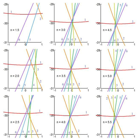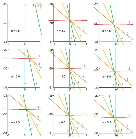 With the far-range approximation relaxed, a SAC having an additional dimension is demonstrated here to simulate finding range as well as direction to an acoustic source. Having generated simulated measurements of arrival time differences by computing values of for = 3.5 (using Equation (8); these values populate column 4 in Table 1) we now treat range to the acoustic source as though it were unknown to illustrate how SACs for multiple values of may be used to optimise the value of to provide an estimate of range. From the simulated measurements of for = 3.5, we compute values of using Equation (9) for simulated trial values of ranging from 1.5 to 5.5 (in intervals). These data populate Table 2 and are used to generate the lambda plots for each of the trial values of shown in Figure 2.