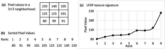 LFDP is a rotational- and illumination-invariant textural descriptor developed and implemented by the authors of this paper. LFDP represents gray values variability in a local neighborhood by a single number. In this method, an ascending vector was created by sorting pixel values in an n × n window (Figure 1a,b), and its plot was considered as the texture signature for that corresponding window (Figure 1c).