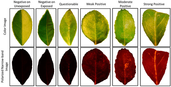 In contrast to fluorescence sensing approaches that provide an overall indication of the stress status of the plant, polarized imaging directly detects the presence of starch. It has long been noted that starch accumulates at high levels in the leaves and bark phloem of HLB-affected citrus trees and is highly correlated with the presence of the disease [15,16,17]. Polarized imaging is based on the optical property of starch, which rotates light by 90° optimally at a wavelength of 591 nm [18], which has proven to be an efficient means for real-time and large-scale detection of HLB in the field [19,20]. It was previously shown that the polarized imaging technique was not only capable of producing high HLB detection accuracies but also was able to differentiate between starch accumulation (as an indication of Clas) and the deficiency of certain nutrients in leaves [21]. Previous polarization studies all used leaves that were highly symptomatic for the HLB-positive samples. However, the efficacy of this approach at detecting HLB in asymptomatic leaves has not been previously evaluated.