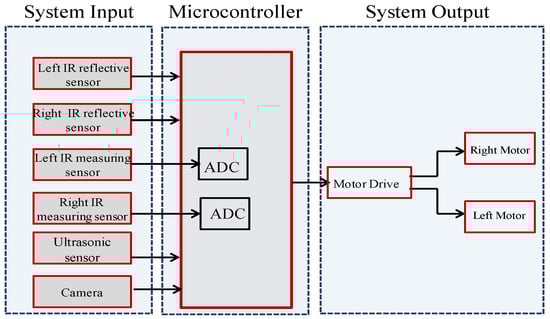 The block diagram of the proposed motion planning approach is provided in Figure 1. It utilizes multiple sensors: two infrared reflective sensors for edge detection, two infrared measuring sensors, an ultrasonic sensor, and a camera for obstacle detection. The output of the IR measuring distance sensors is analog in nature, as it is based on the amount of reflected light. Thus, the analog output needs to be processed to generate digital signals containing information about the obstacle’s distance using an Analog to Digital Converter (ADC). Then, the microcontroller processes all of the data acquired from the mounted sensors and sends control signals to the motor drive in order to perform the required moves. Modeling of the robot’s environment and the typical characteristics of the various sensors used in this work are described in further detail in the next section.