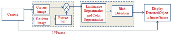 Video cameras are one of the most commonly used sensors in a wide range of applications, such as the detection, tracking, and recognition of objects. A single onboard camera has been mounted at the front of the robot to detect and track objects. The object detection process can be divided into four main procedures, as illustrated in Figure 2 and the following four algorithmic steps:
