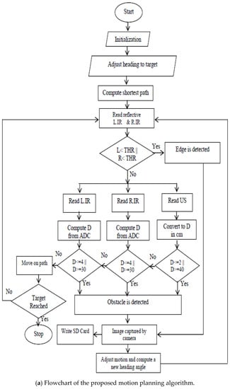 Figure 3 presents a flowchart describing the proposed motion planning approach. The proposed model deploys a searching algorithm to find the shortest path from a given point to the target. It has been widely used in path finding for its reduced search space. It uses a best first search, where it takes an input, evaluates a number of possible paths, and produces the least-cost path from a given source to the destination [15]. As the robot follows the least-cost path, it maintains a sorted queue of alternate paths along the way, in order to abandon a higher cost path segment at any point in time and use the lower-cost segment instead. This procedure continues until the target is reached [15]. The cost of the path can be calculated based on the distance traveled from a given point to another, as follows: