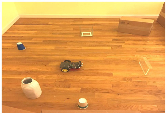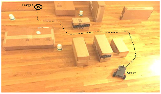 Consider an environment which has static obstacles of different shapes. The environment contains polygonal, convex, curved, and transparent obstacles of different shapes and sizes. The first experiment was conducted to examine the ability of the infrared and ultrasonic sensors to detect static obstacles and avoid collisions, as illustrated in Figure 5.