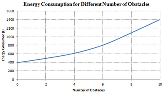 Data acquisition (DAQ) was used to monitor the energy consumption while the robot is traveling from a given initial position to its goal, avoiding different types of obstacles. To illustrate the results, further experiments were conducted with a different number of obstacles, as shown in Figure 10. The energy consumption increases as the number of obstacles increases. The mobility energy is 397 (J) to cover 0.71 (m), which is the minimum distance from the source to the destination when no obstacles were found in the path. The energy consumption has an asymptotic complexity of O(nlogn), where n is the number of obstacles.