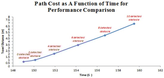 The time-distance graph of the proposed algorithm is depicted in Figure 11. The minimum distance from a given initial position to the goal is 0.71 m, which is covered in 149 s when no obstacle is detected along the path. Considering obstacles in the path, the time and travel distance will increase as the robot consumes more time and distance to spin around the obstacles and avoid collisions. The distance and time traveled have an asymptotic complexity of O(nlogn), where n is the number of obstacles.