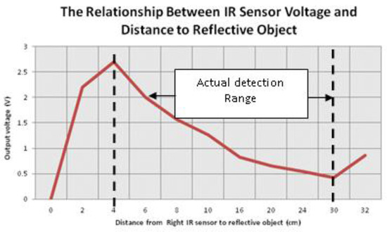 The Sharp GP2D120 (Sharp Microelectronics, Osaka, Japan) has a detection range between 4 and 30 cm, and the corresponding ADC values range between 530 (for a distance of 4 cm) and 80 (for a distance of 30 cm). Both sensors return an incorrect value for a distance out of their detection range (less than 4 cm and greater than 30 cm). For example, at time t0, no object is detected, as both sensors’ values are out of the detection range. At time t5, both sensors’ values are greater than 80 and less than 530, which indicates that a front object is detected by both sensors. At time t22, the right infrared sensor detects an object, while the left infrared does not, which indicates that the object is positioned at the front right of the robot.