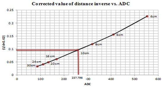 where ADClevel is the analog detecting level (=1023 in our robot), Outvol refers to the analog output voltage at any given distance, and optvol refers to the system operating voltage (5 V in our robot). In order to find the distance from the analog value, the corrected inverse of the analog voltage related to ADC is computed in Figure 13.