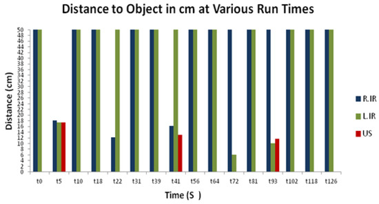 Figure 15 shows the distance to the object at different experimental times. The distance to the object has been computed based on all of the sensors’ readings, to determine how far the object is from the robot.