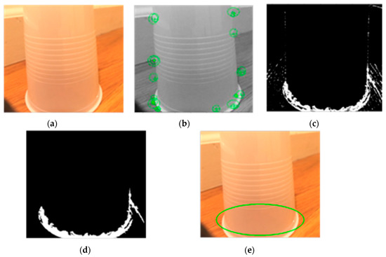 (a) A selected frame from the reference video; (b) Feature points detected; (c) Resulting binary masks from the segmented image (where abandoned objects appear); (d) The resulting binary image is cleaned with morphological filtering to clean up the mask image and remove points that do not represent the object; (e) The result of the detected object.