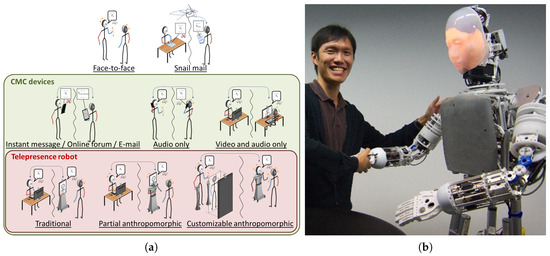 The different mediums for interpersonal communication. (a) Various mediums for interpersonal communication ranging from FTFC to CMC; (b) an instance of a customizable anthropomorphic telepresence robot, EDGAR-1 (Expression Display & Gesturing Avatar Robot).