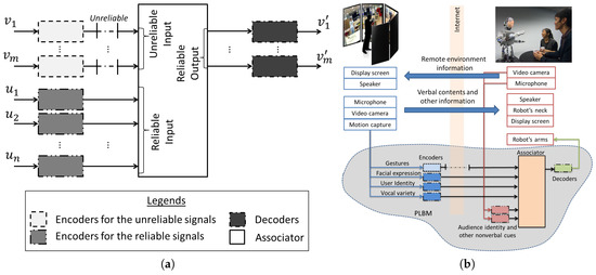 The name of this model is the perception-link behavior model (PLBM) because the conversation partners might react according to what they see during a conversation, and this is the concept behind role negotiation [15] and the chameleon effect [16]. Alternatively, the perception-link behavior model (PLBM) is also an online associative multimodal model with encoding and decoding capability (Figure 3a). It can be implemented into a CATR’s framework to associate multiple modalities, as shown in Figure 3b. Primarily, it has three components: encoders, decoders and associator.