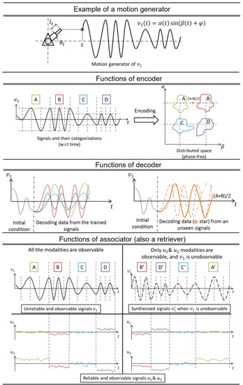 The following descriptions are the function of each component with a simple example. The encoder transforms the input signal into distributed output, and it groups similar signals nearer to each other. For example, let us assume that there exists a motion generator (Figure 4, Row 1) with two degrees of freedom: linear and rotation . During the training process, the motion generator only generated four signals, A, B, C and D, by varying and . The encoder should learn the distributed features and using the training signals. Subsequently, the encoder can map any signal, including , into the new space, as shown in Figure 4, Row 2, where the signals with similar dynamics are grouped nearer to each other. From the distributed output, the decoder should extrapolate the gesture motion without losing its expressiveness. Once the encoder has mapped a signal to its distributed output, the decoder can take the distributed output and transform it back to its originals dynamic (Figure 4, Row 3). Lastly, the associator can learn relationships between multiple modalities. If necessary, it can retrieve the missing signal from its knowledge base. Figure 4, Row 4, left, shows the relationship of a motion and the two other signals and . If these relationships are consistent, then the associator can leverage this knowledge and create a list of rules of these relationships. In a different situation (Figure 4, Row 4, right), if there were a missing channel , the associator could exploit the knowledge base and retrieve a synthesized signal given the observable signals and .