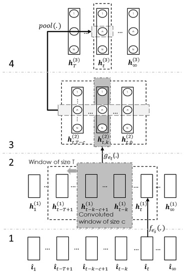 where are the model parameters, which were trained using contrastive divergence [19], and is the number of feature maps in the second layer. The third layer is the convolution layer. Initially, this layer pulls out a T sequence of spatial data . Sequentially, it pulls out a subset of c size from the above sequence for every k step, and k ranges from . In each k step, the model calculates the convoluted output: