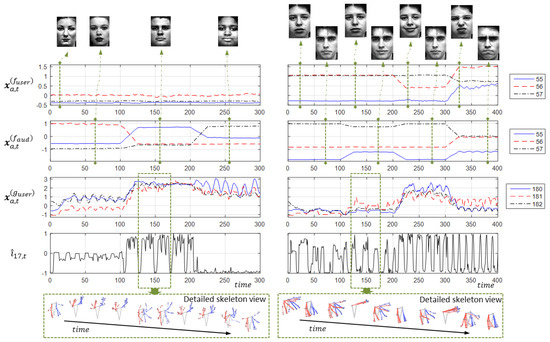 Figure 11b shows the differences between the various output layers from a segment of gesture signals, which has two gesture styles. The following descriptions are the observations from each layer. For the input layer, the differences in the frequency and magnitude of the signals can separate the two gesture styles. In contrast, the two gestures, from and , can be differentiated from the degree of the activation, alone. However, there is a delay in the transition, about 25 frames, in as compared to or . In short, the encoder successfully maps the gesture signal into its style. In the next experiment, it will illustrate the generation power of the decoder given the gesture style.