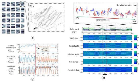 Visualization of features and results from the encoder and the decoder. (a) The 30 convolution features (left) and its fifth convolution feature (right) by CNN-RBMusing a 15-FPS dataset. (b) The encoded output given a segment of gesture with two different styles with specific features. (c) The LSTM internal states and output, nine gestures, given their encoded data.