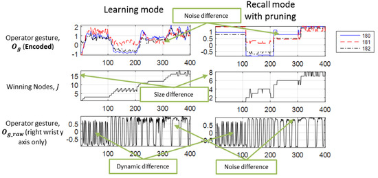 The associator will switch to the recall mode (Figure 8) when there is one or more missing modalities. For this case, the following explanation assumes that the user’s gesture feature is missing. Hence, there is a newer and shorter input: