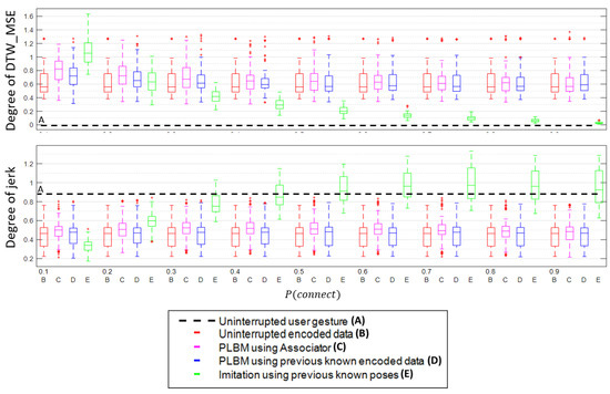 Figure 15 shows the overall performance of the various signals across different degree of connection using both datasets from Figure 9. From the top figure, D is more accurate than C for most cases. D is closer to B when the connection is between 0.1 and 0.8. Eventually, D and C converge with B at 0.9. From the other figure, all of the PLBM signals (B, C and D) are smoother than the other two signals (A and E). On average, the PLBM signals have their jerk indexes between 0.45 and 0.50. On the contrary, A has its jerk index at 0.88, and E has most of its index above 0.6. Lastly, the jerk index for E is higher than A when the connection rate is high. The jerk index of E is above 0.88 when the connection is from 0.5 to 0.9.