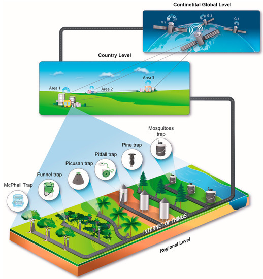 In Figure 1 we envisage how insect surveillance can be applied at local, regional, country, continental, and global scales using the emerging technology of IoT. Local networks become themselves nodes in larger networks until reaching global coverage.
