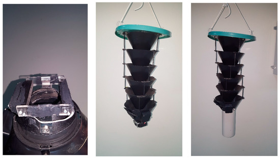 Pine Beetle Lindgren Trap (Figure 4) is a form of a funnel trap. Lindgren pheromone traps are widely used to attract the pine beetle Dendroctonus ponderosae Hopkins (Coleoptera: Curculionidae) [36,37]. They are used either as monitoring traps or for mass trapping to reduce the populations of pine beetles.