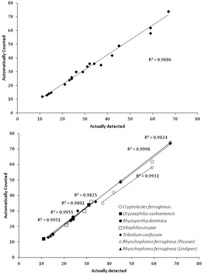 Results from the evaluation of the prototype traps are presented in Table 2 and Figure 5. As is clearly concluded from our data, our system is very accurate, reaching 98–99% accuracy on automatic counts compared with real detected numbers of adult beetles in each trap. The accuracy of our system in detecting adult beetle catches is also shown by the very high (r > 0.99 in all cases) correlation between the generated signals and actual numbers of insects caught in the trap.