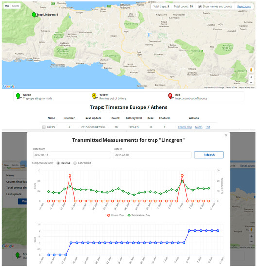 Traps equipped with a detection sensor and wireless communication abilities have some distinct advantages compared to manual monitoring. They can monitor insect populations 24 h a day, upon their entrance to the trap, every day of the year, in dispersed nodes across a variety of fields, simultaneously, and all counts and recordings can be permanently stored in a cloud service. Another distinct advantage is the determination of the precise onset of an infestation. The time-schedule of trips to the field for trap inspection may not coincide with the initiation of a pest population increase, whereas automatic monitoring and reporting can be set in real-time (or more practically in a daily schedule). Real-time reporting, in our opinion, opens up new grounds in agricultural research and mainly in crop protection as—besides a timely control action in response to a pest infestation—it can help in the evaluation of the impact of a control treatment (e.g., chemical spraying, release of beneficial entomophagous insects etc.), and therefore schedule future actions accordingly.