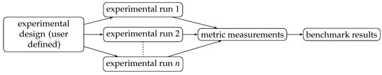 The key requirement for a testbed is the automation of the benchmarking process (see Figure 2). It starts with a user defined experimental design, in which the user specifies the value of parameters, and the data to be collected during the experimental runs. Then, experiments are automatically performed by the testbed, without any manual intervention. Besides, the experiments are independent of one another, which can run either sequentially or in parallel, depending on available resources. Last, collected data are post-processed in order to compute evaluation metrics dedicated to quantitative benchmarking performed experiments, and compare various settings (i.e., parameter values).