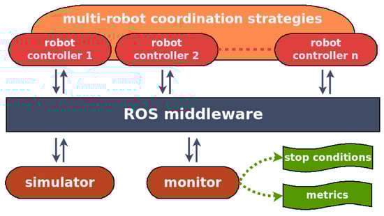 Each robot controller materializes as a set of ROS nodes. For the sake of realistic benchmarking, we use the same controller as the one running on actual robots. The coordination strategies is shown as cross-cutting the robot controllers since we are mainly interested in distributed approaches. This means each robot controller should provide some ROS nodes dedicated to coordination. However, our architecture also support centralized approaches, for which the ROS nodes dedicated to coordination can be performed independently from the robot controllers.